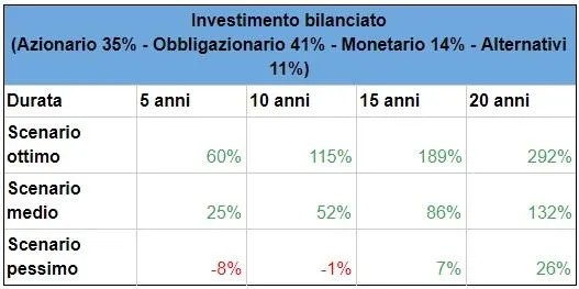 Analizzando i risultati in modo numerico, è possibile comprendere come variano nel tempo in tre scenari distinti: ottimo, medio e pessimo, tenendo conto di investimenti con profili cauto, prudente, bilanciato e dinamico.
